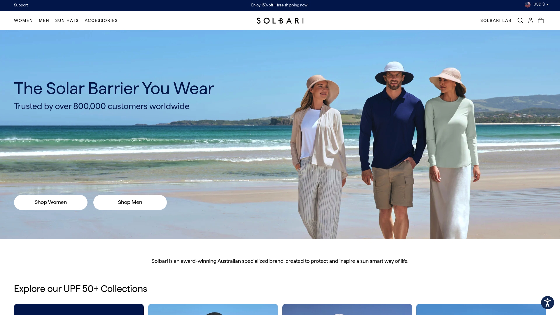 Solbari focuses on sun protective apparel for men, women, and children with a wide product range that includes sun hats, clothing, swimwear, and accessories. The collections emphasize high UPF ratings and practical designs meant for extended outdoor use and travel.