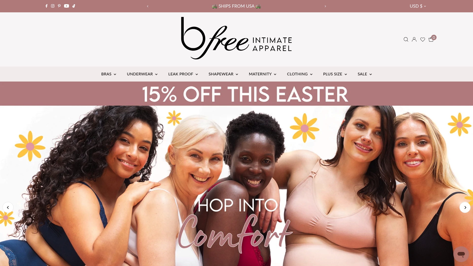 B Free centers on a wide variety of lingerie and underwear, covering maternity, nursing, sports, plus size, and post-surgery needs with shapewear and essentials. The range targets comfort, support, and everyday style.