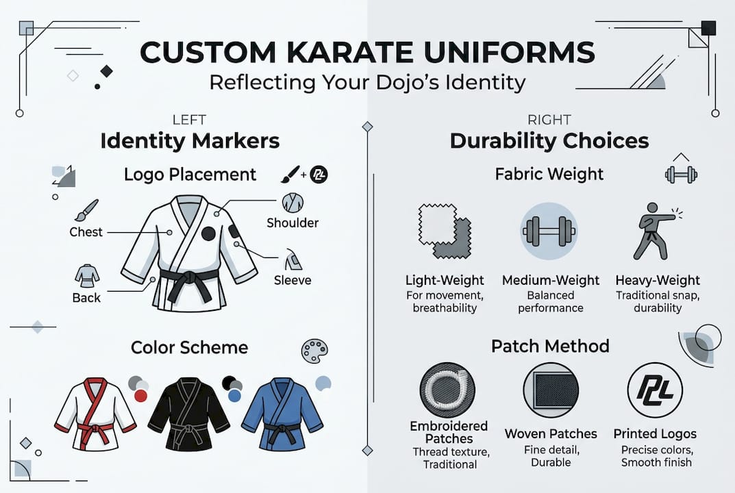 The essential elements include fabric weight selection between 8-14 oz based on your training focus, color choice that reflects your dojo identity while considering competition requirements, and strategic patch placement with your logo on the left chest and secondary patches on the right sleeve. You should also decide on personalization options like student names and whether you need separate competition and training uniform designs.
