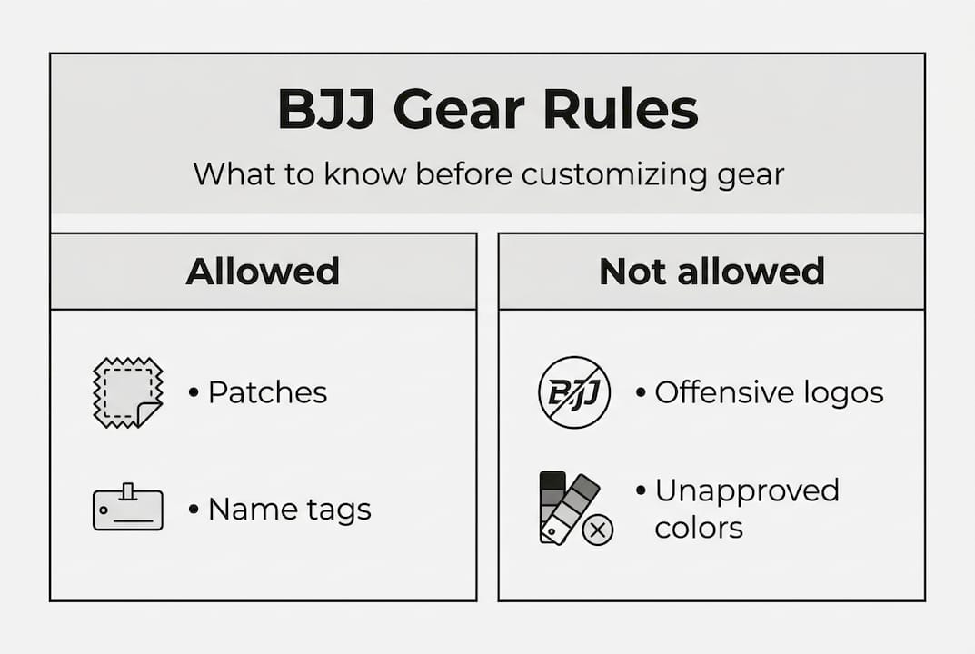 Ignoring competition regulations creates problems if you decide to compete. Some tournaments disallow certain patch placements, prohibit offensive designs, or restrict gi colors and personalization. Check your organization's rulebook before customizing competition gear. Keep one set of gear for tournaments and another for training if you want more creative freedom.