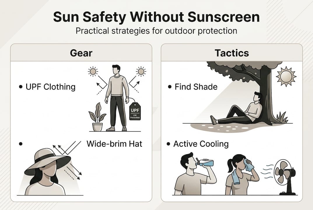 Clothing choice is critical. Lightweight, loose, light-colored clothing keeps you cool and provides physical UV blockage without any chemical product. Dark, tight fabrics trap heat and offer less comfort during sustained activity.